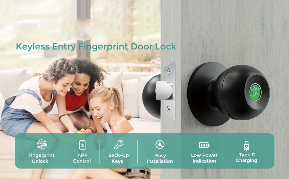 Smart Door Knob, Fingerprint Door Lock, Smart Lock Biometric Door Lock Fingerprint Door Knob With Tuya App Control, Suitable For Bedroom, Cloakroom, Apartments Offices, Hotels (Battery Included)